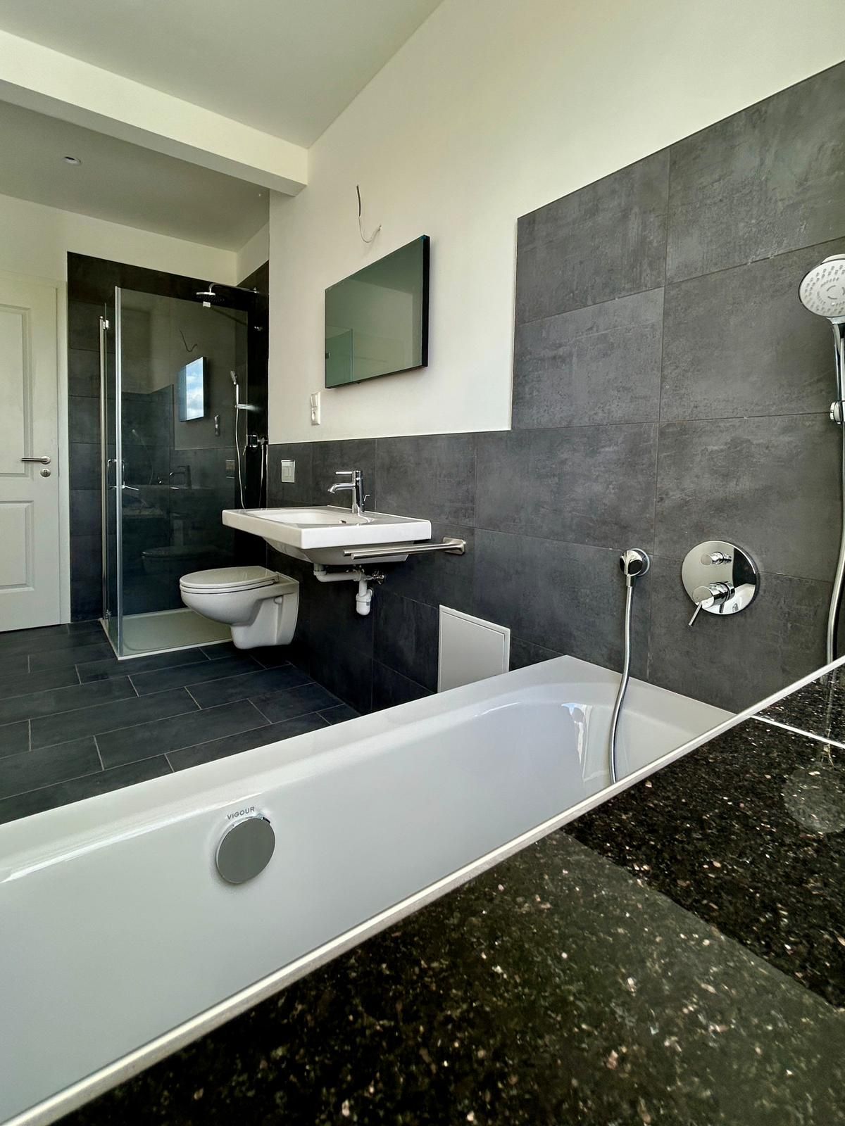 - Grosse Badewanne ca. 180 x 80 - Regendusche barrierearm - Verglasung randlos - Badspiegel mit LED