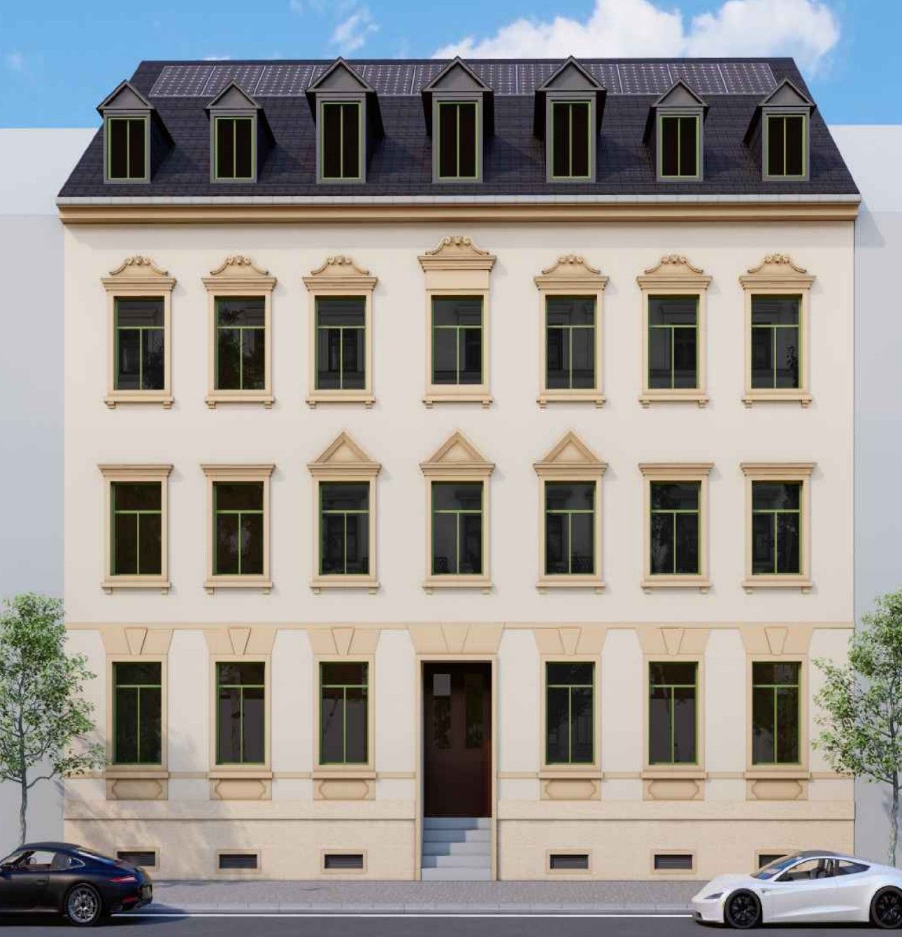 - Photovoltaik – Straßenseite und Balkondächer mit Photovoltaik belegt